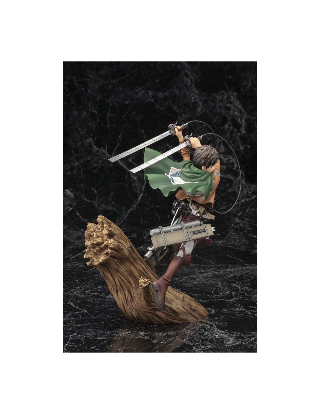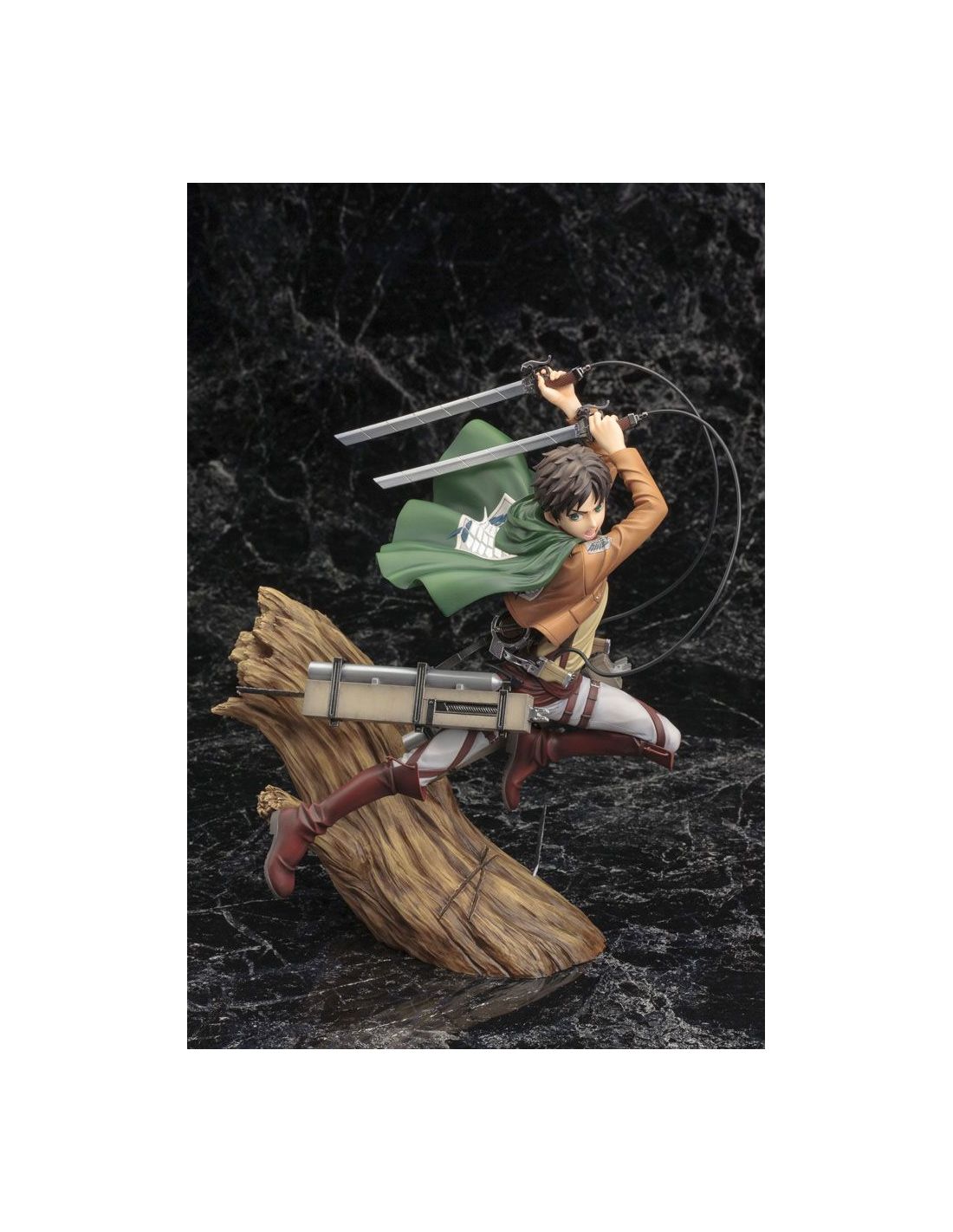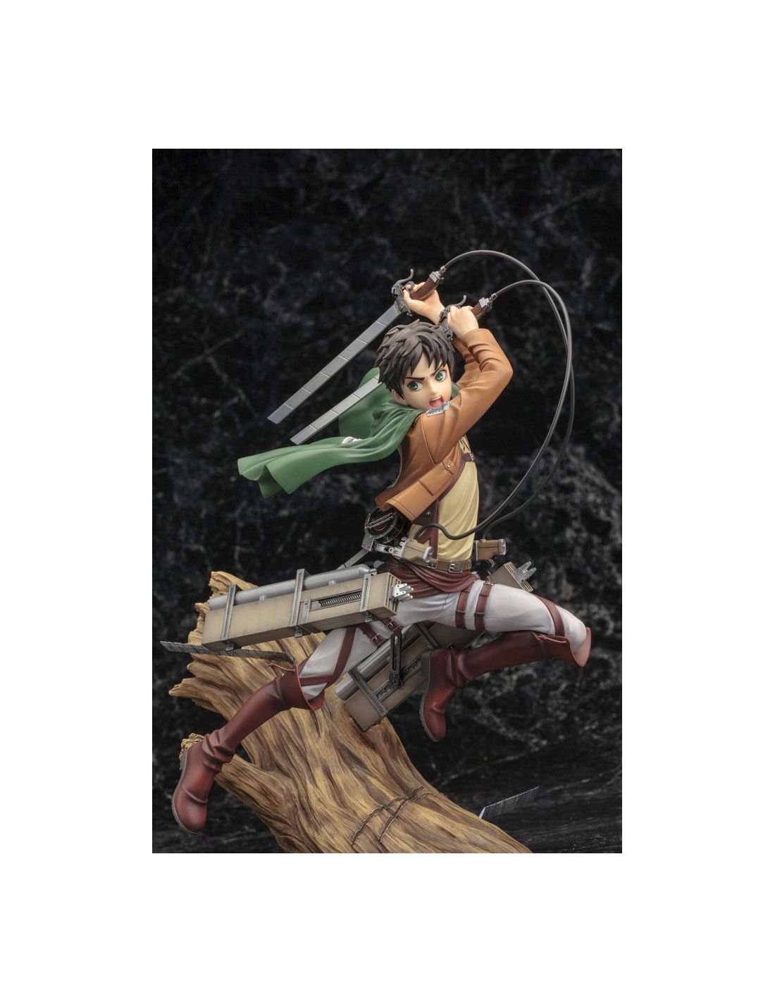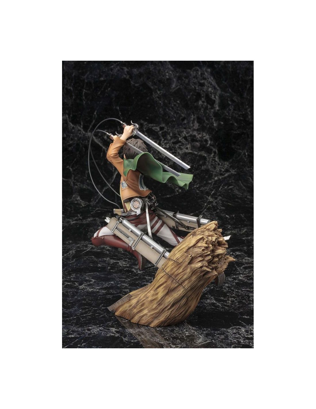 Espectacular figura de Eren del anime Ataque a los titanes fabricada por Kotobukiya. En ella podrás ver a Eren en pose de batalla propulsándose en un árbol, sin duda, un regalo impresionante para un o una fan del anime.
