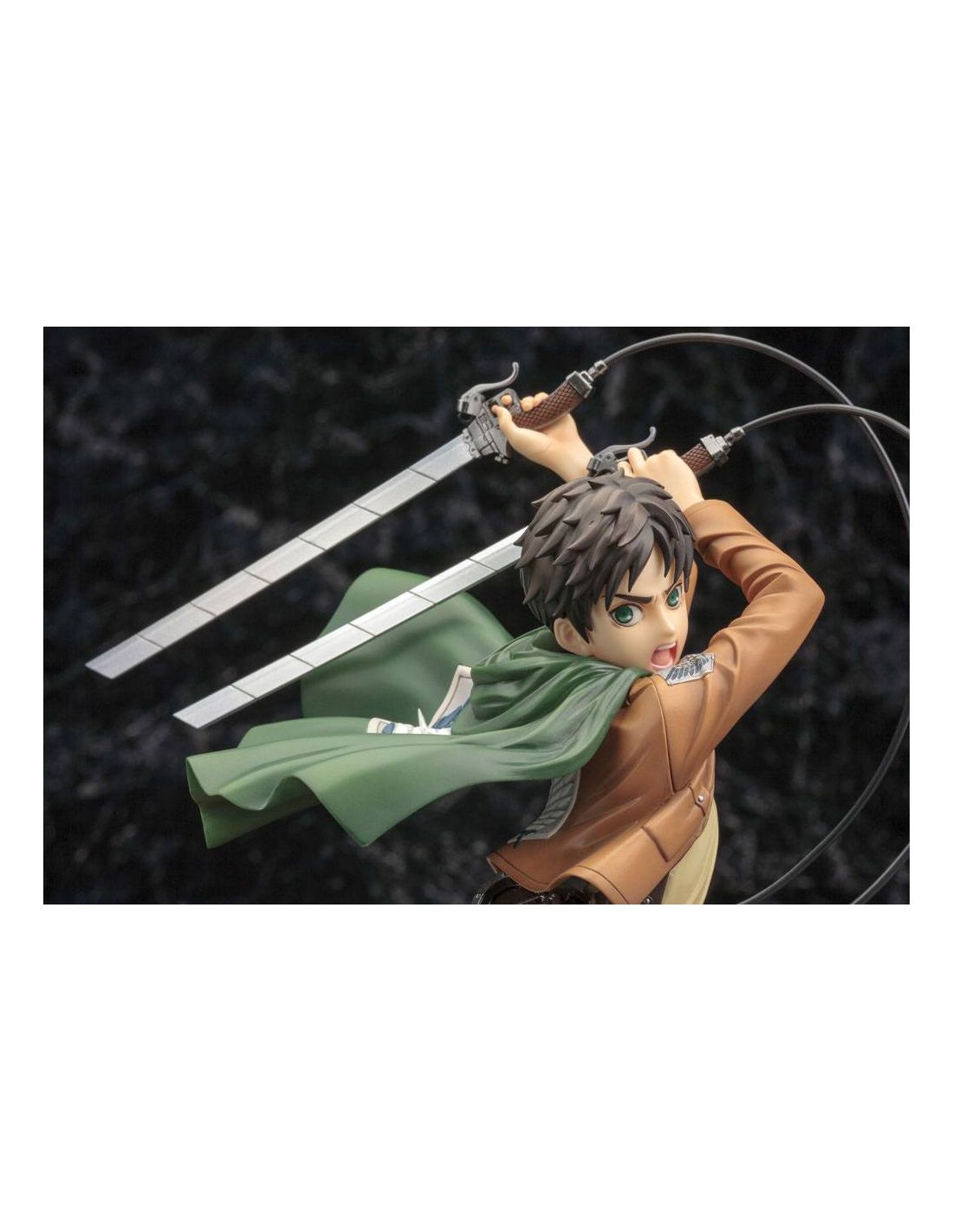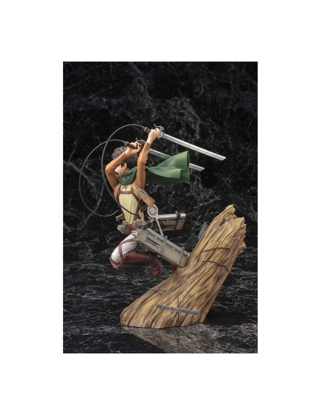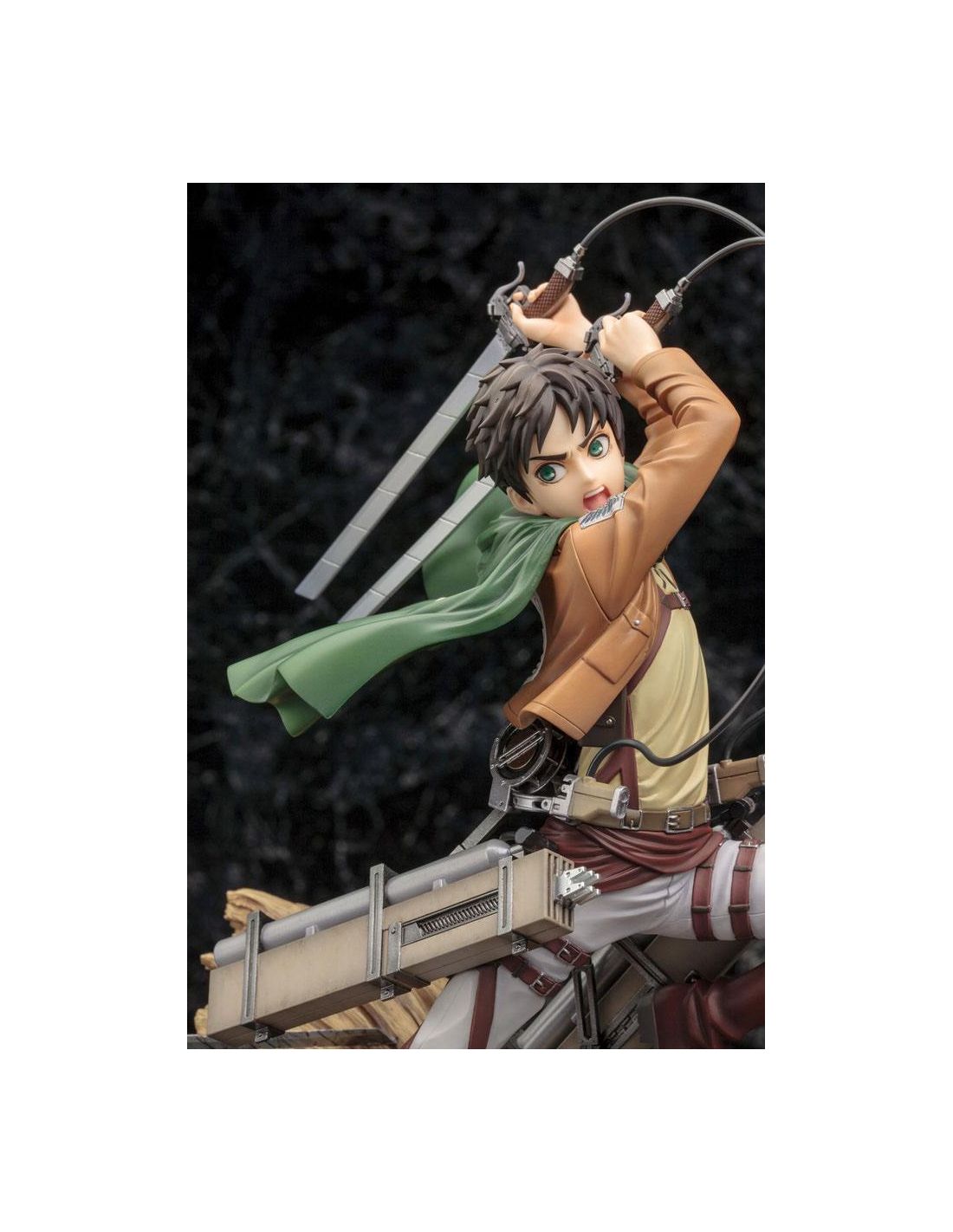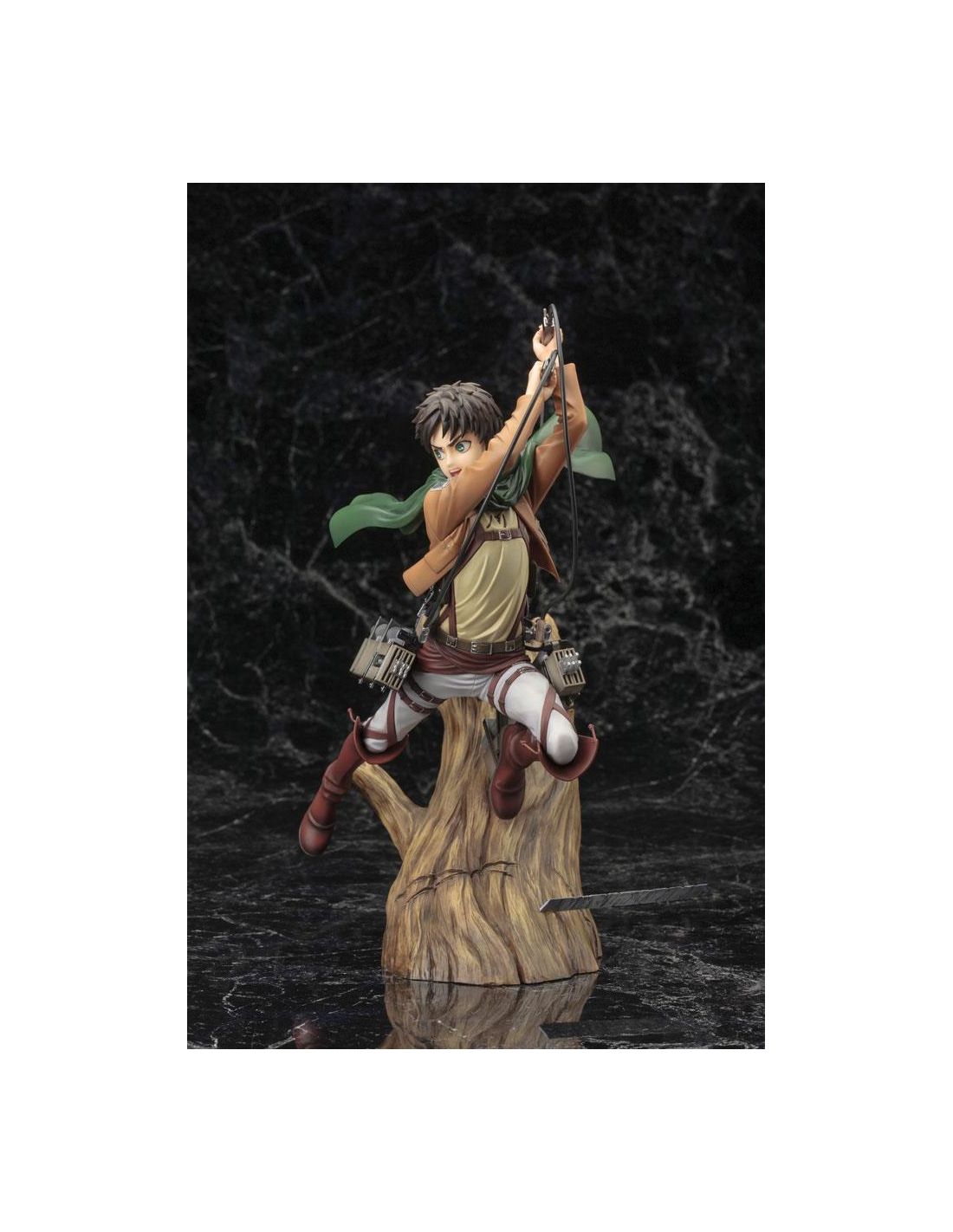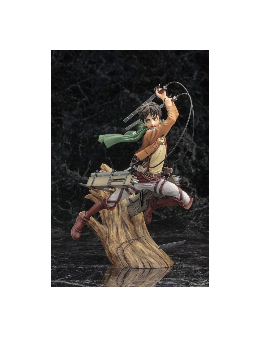 Espectacular figura de Eren del anime Ataque a los titanes fabricada por Kotobukiya. En ella podrás ver a Eren en pose de batalla propulsándose en un árbol, sin duda, un regalo impresionante para un o una fan del anime.