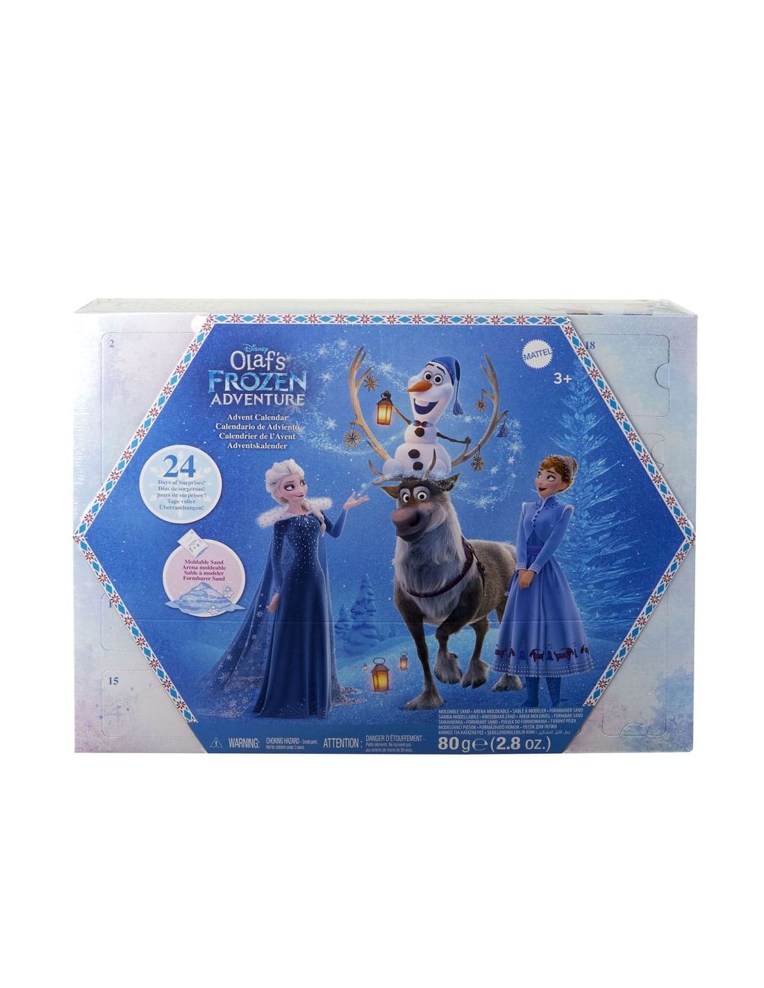 Con el Calendario de Adviento Disney Frozen, ¡los niños podrán celebrar la alegría de las fiestas con 24 días de diversión! Cada día está lleno de sorpresas, como las muñequitas de Anna y Elsa (9 cm) y las figuras de los amigos Olaf y Sven. Hay más de 20 regalos más esperando a ser descubiertos, como arena moldeable, moldes de arena y piezas de juego desplegables. ¡Es un regalo navideño perfecto para los fans de Frozen de Disney y La aventura congelada de Olaf! Los muñecos no se pueden montar solos. Los colores y las decoraciones pueden variar. Incluye 2 muñecas pequeñas, 2 amigos animales, 1 bolsa de arena moldeable y 24 accesorios.