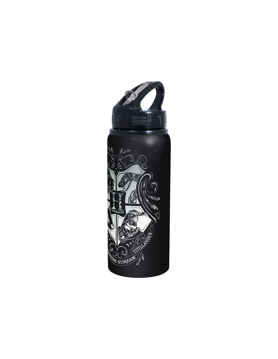 Practica y original cantimplora de Harry Potter fabricada en aluminio en color negro con el escudo Hogwarts en blanco.
