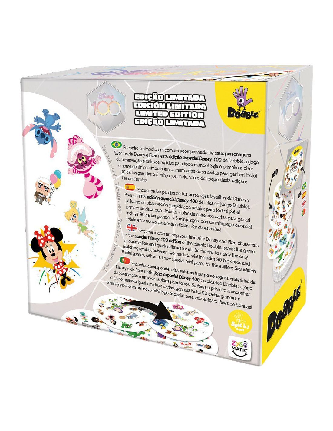 Disney 100 Dobble es una versión de edición limitada, que consta de 90 cartas, compuestas por 91 símbolos, con 10 símbolos en cada carta. Entre cada 2 cartas, siempre hay 1 símbolo, y sólo 1, que se repite. ¡Descúbrelo!