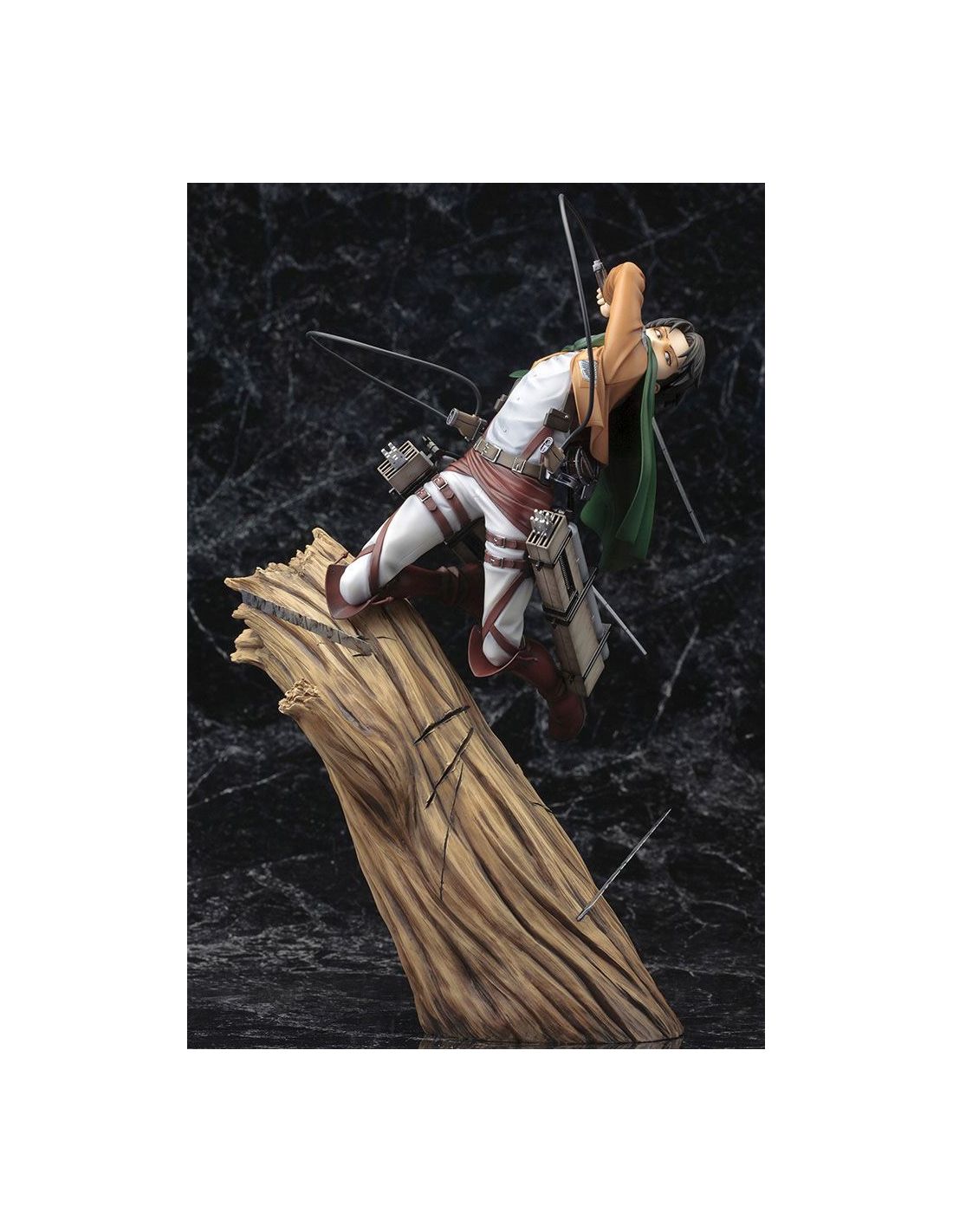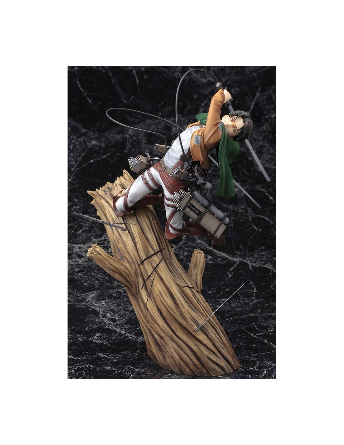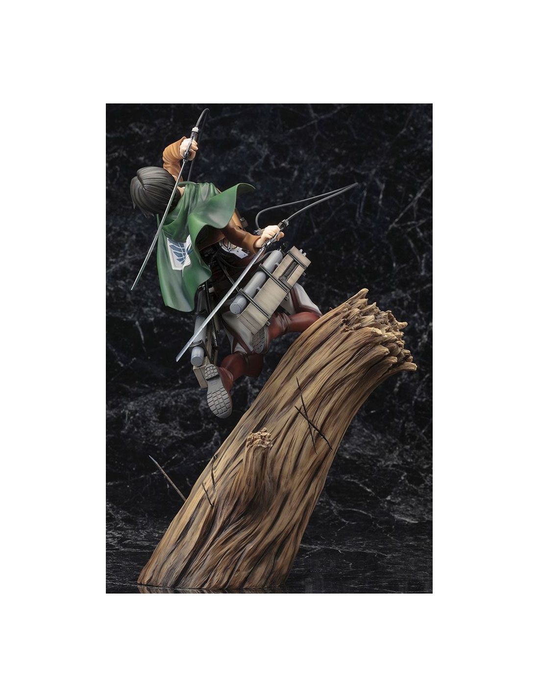 Exquisita figura de Levi en pose de batalla encima de un árbol. Si eres seguidor de Ataque a los Titanes y amas el cuerpo de exploradores, esta figura Levi es el regalo perfecto para ti.