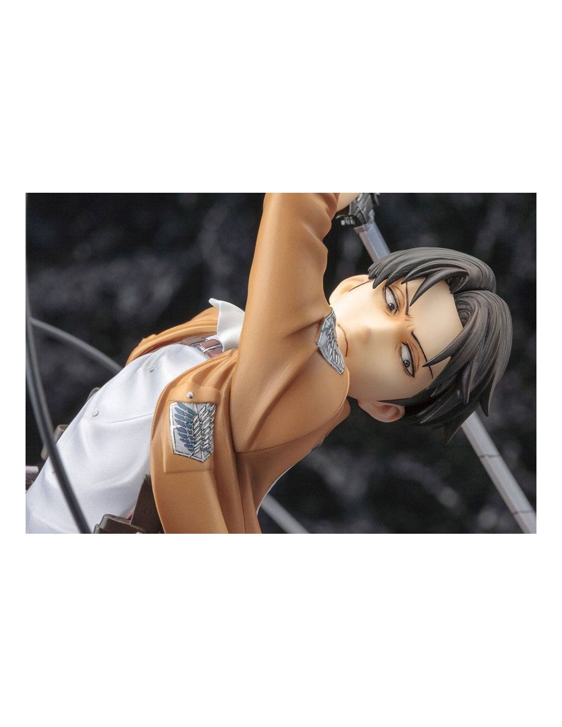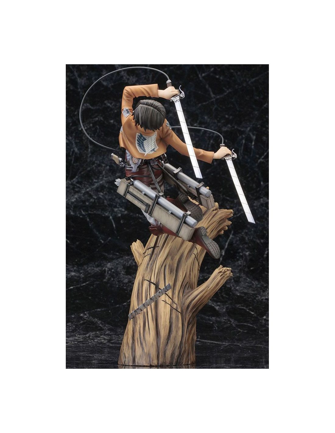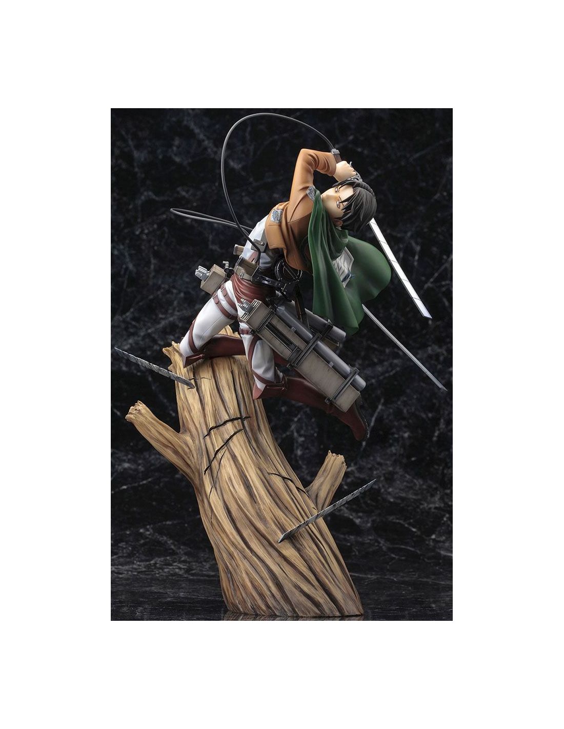 Exquisita figura de Levi en pose de batalla encima de un árbol. Si eres seguidor de Ataque a los Titanes y amas el cuerpo de exploradores, esta figura Levi es el regalo perfecto para ti.