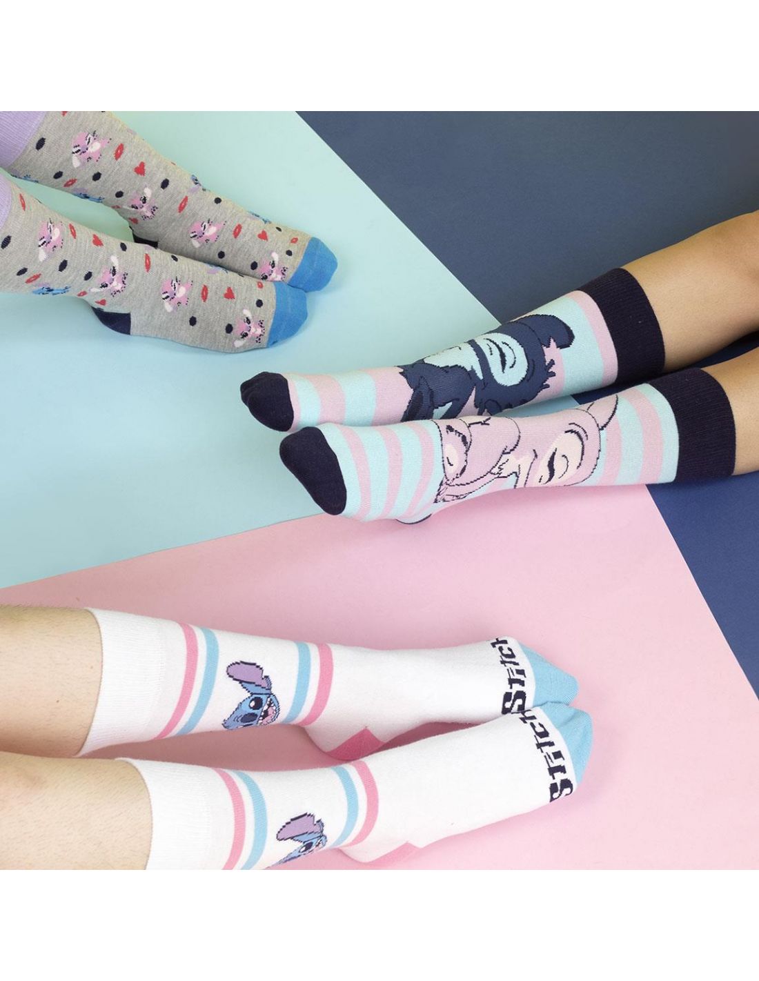 Pack calcetines Stitch Disney, con tres modelos de calcetines Lilo & Stitch ideales para hacer un regalo friki a amantes de las películas Disney y de Lilo y Stitch.