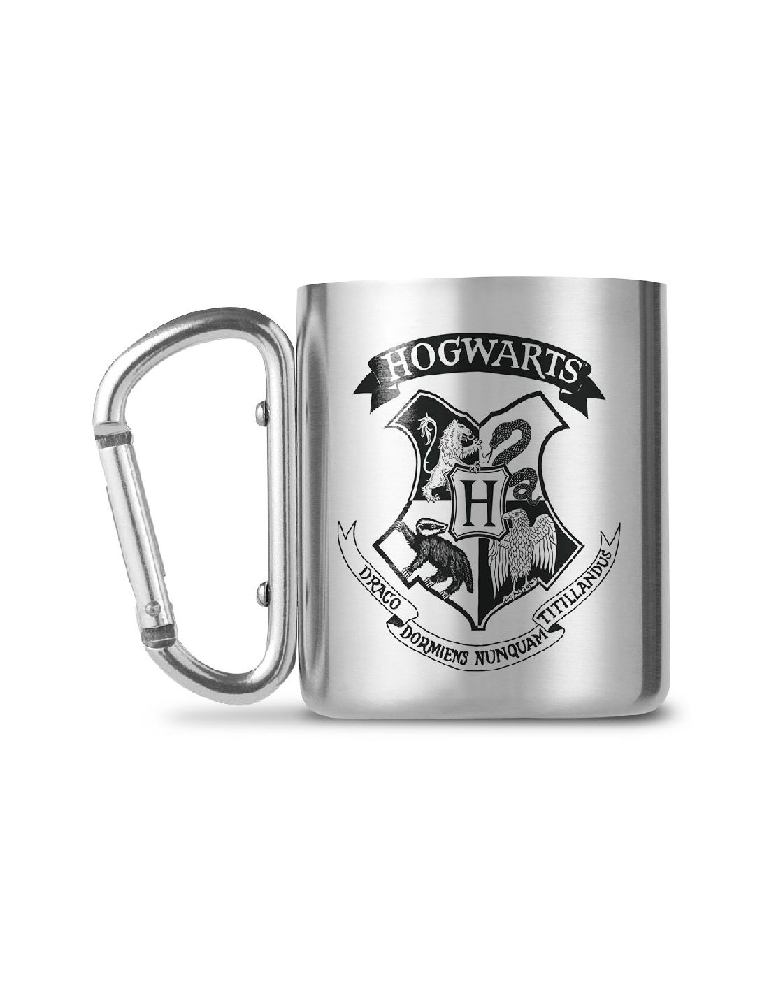Taza de acero inoxidable de Hogwarts. Si Harry Potter la hubiera tenido, estaría cada fin de semana de excursión al Bosque Prohibido con Ron Weasley y Hermione Granger, además, incluye mosquetón para que no se escape como una snitch dorada.