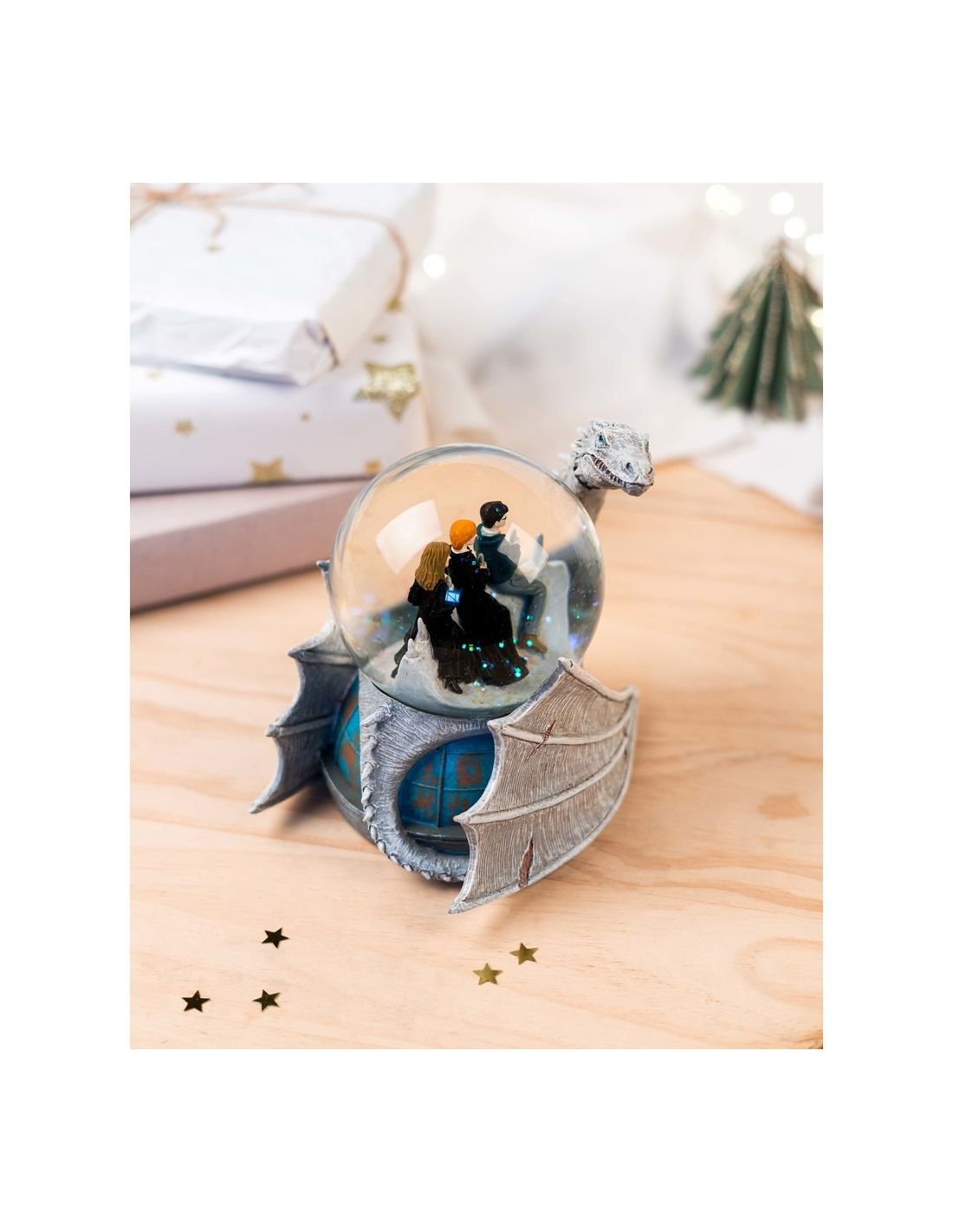Bola de Nieve Harry Potter Dragón Ucraniano, con la famosa escena de la huida de Gringotts de Harry, Ron Weasley y Hermione Granger a lomos del dragón. Un regalo espectacular para coleccionistas de Harry Potter.
