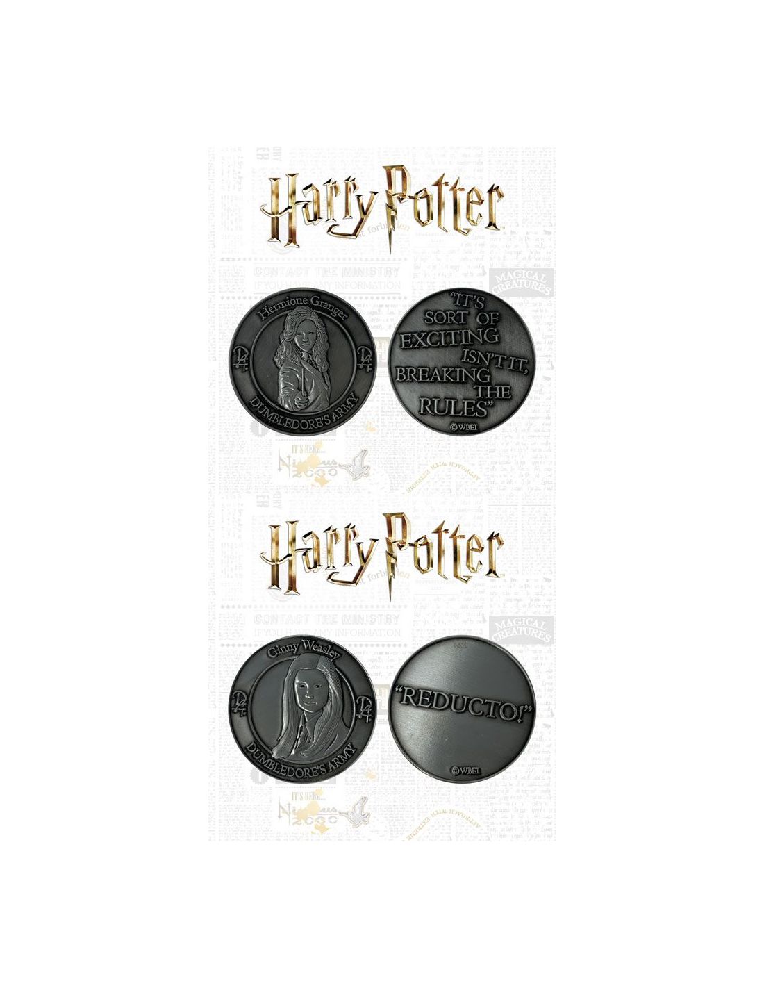 Monedas del Ejército de Dumbledore de edición limitada y numerada, una con Hermione Granger y la otra con Ginny Weasley. Un regalo exclusivo que no puede faltar en tu colección de Harry Potter.