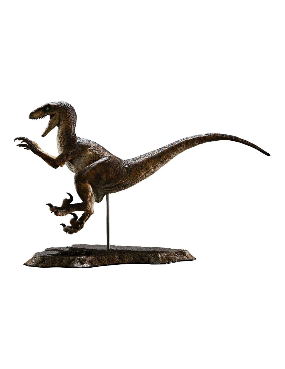 Estatua a escala 1/10 del icónico Velociraptor en acción, fiel reproducción de la película Jurassic Park. Fabricada con materiales de alta calidad como vinilo, PVC y polystone, esta pieza de coleccionista mide aproximadamente 21 cm y cuenta con licencia oficial de la saga.Jurassic Park.Collectible