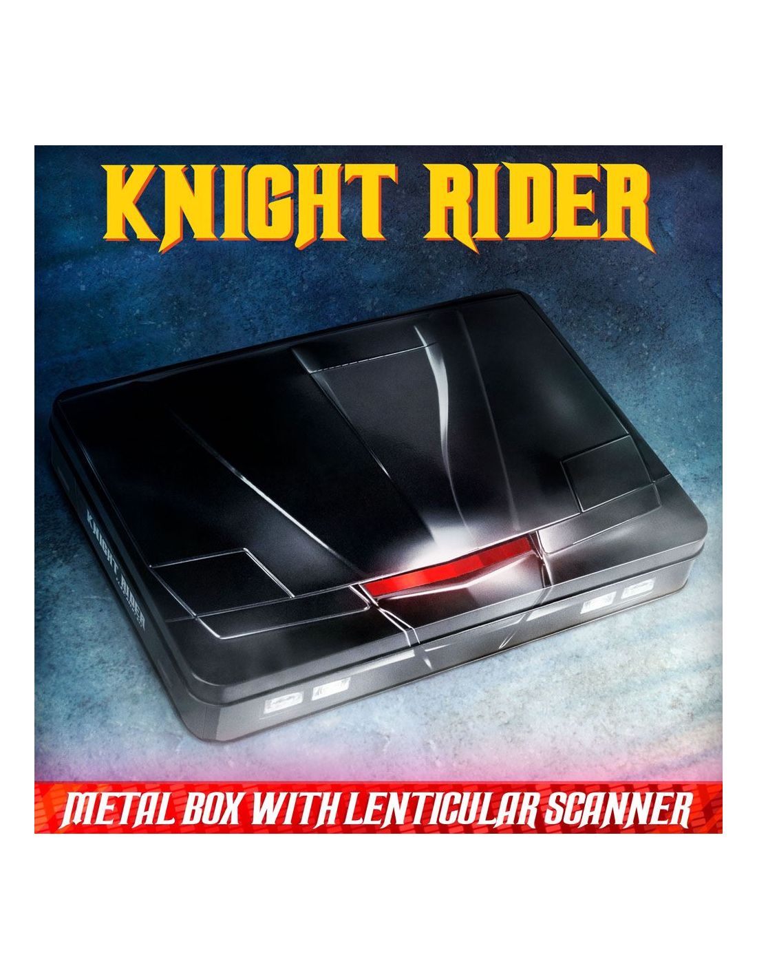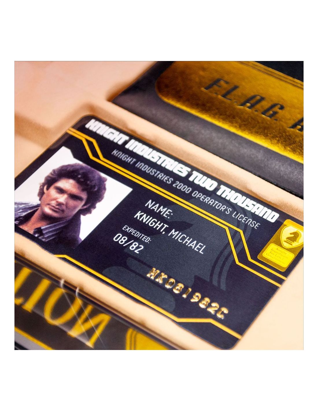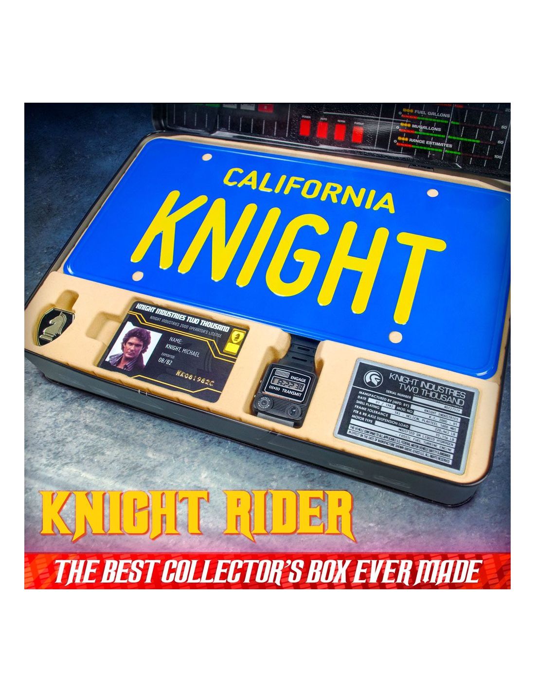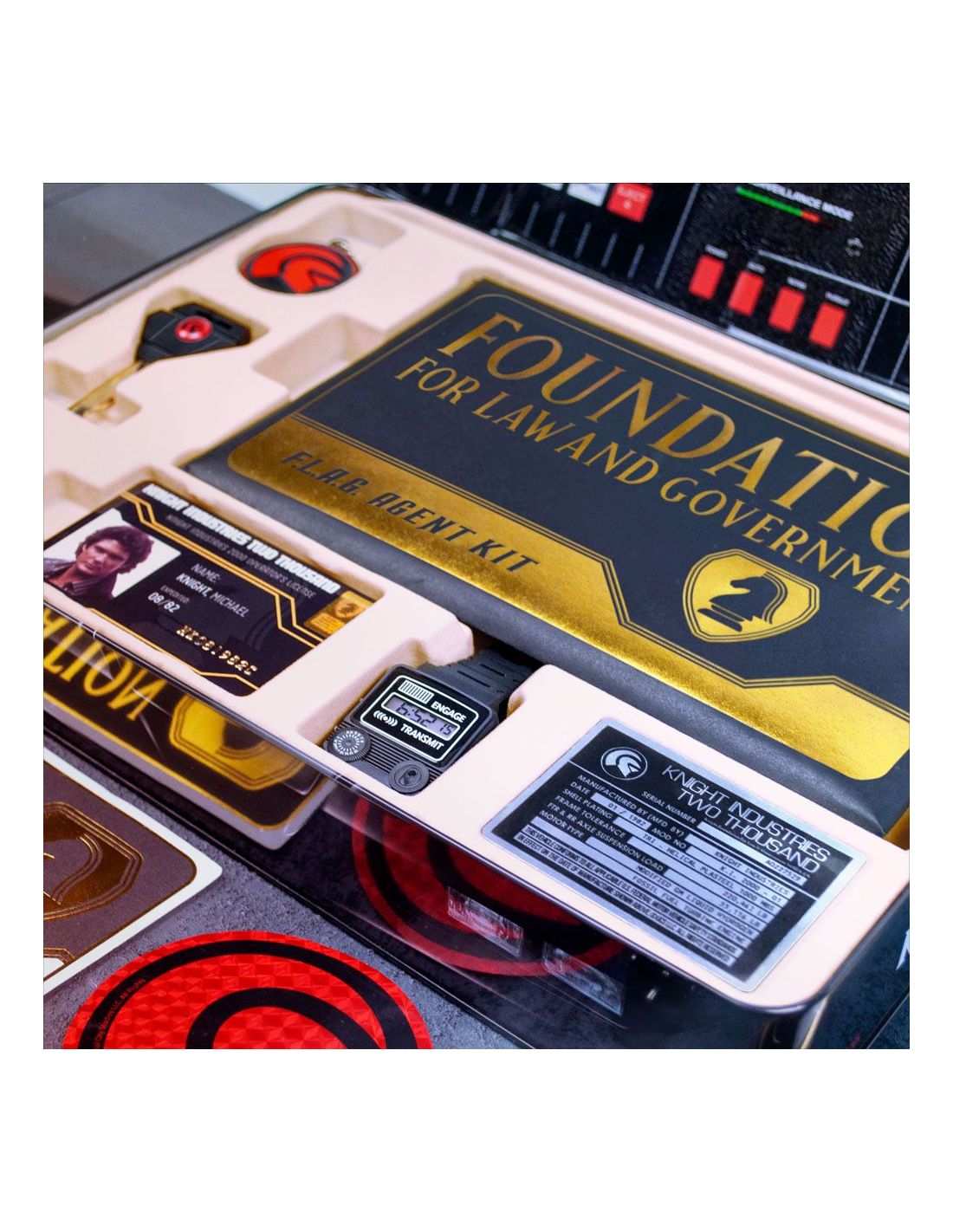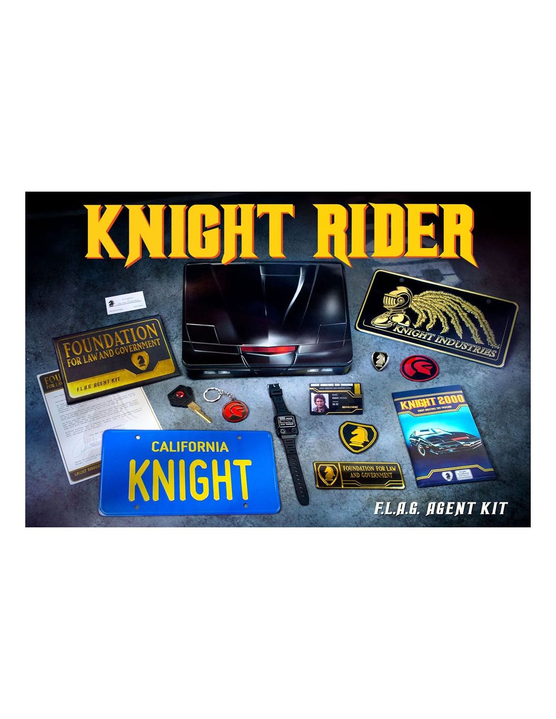 Doctor Collector presenta este kit para coleccionistas. Contenido: - Caja metálica con escáner lenticular - Réplica del reloj comunicador de Michael Knight (réplica de atrezzo con funciones básicas de reloj, no un comunicador real (no, no puedes hablar con KITT)) - Llave de encendido de KITT - Réplica de la matrícula de Knight Rider (incluye pegatinas de CA) - Cartel metálico de tinta dorada exclusivo de F.L.A.G - Licencia de operador de Michael Knight - Llavero de Knight Industries - Carta de bienvenida de F.L.A.G - Parche bordado F.L.A.G - Pin de esmalte dorado de F.L.A.G - Folleto de especificaciones generales de KITT - Etiqueta del fabricante de KITT - Tarjeta de visita de Michael Knight - Pegatina holográfica de Knight Industries - Pegatina dorada de F.L.A.G - Sobre dorado de F.L.A.G