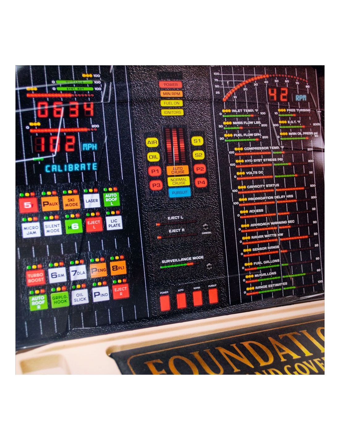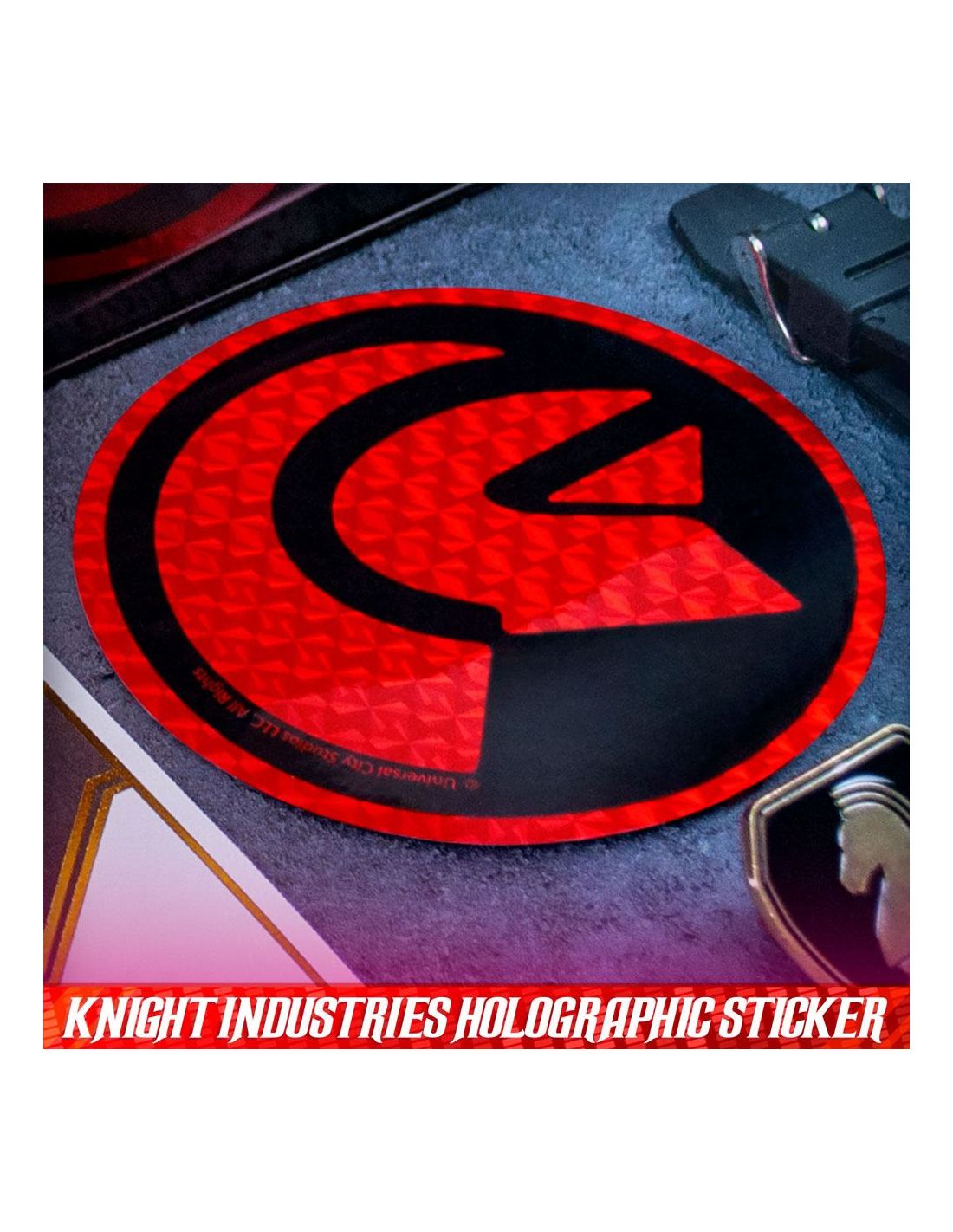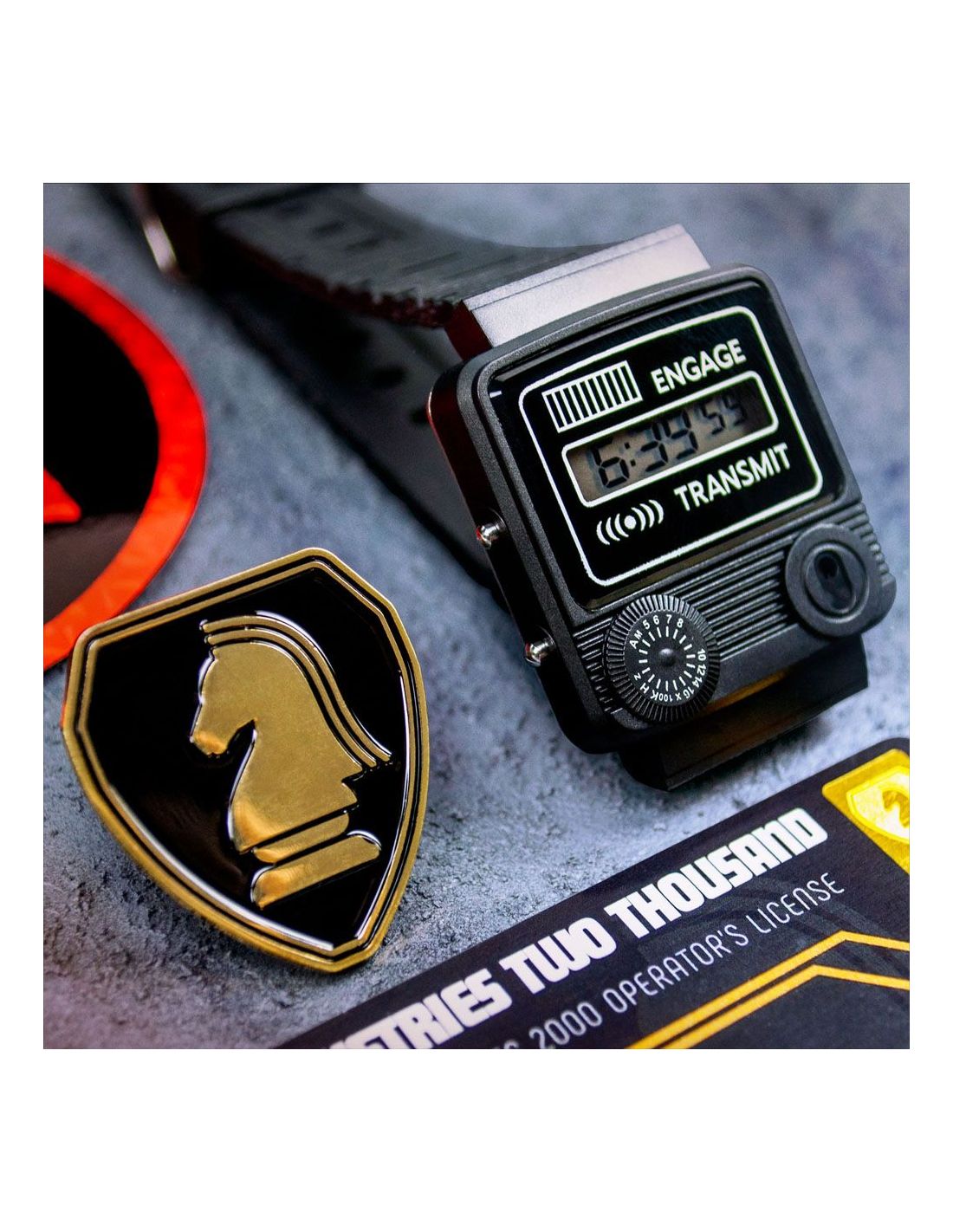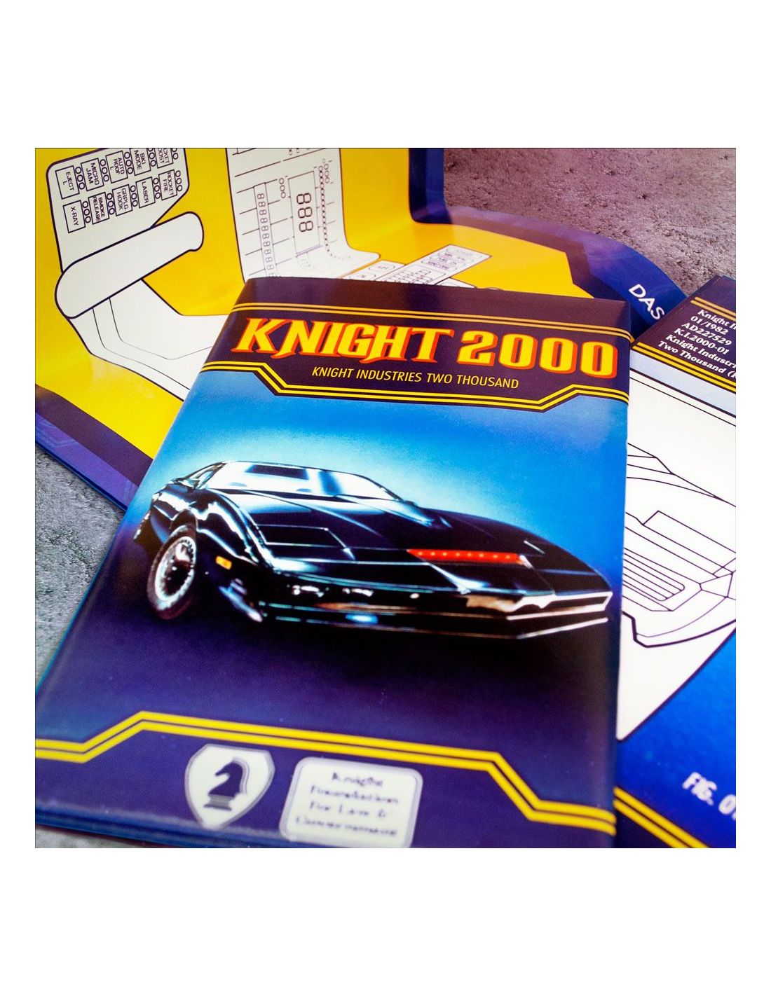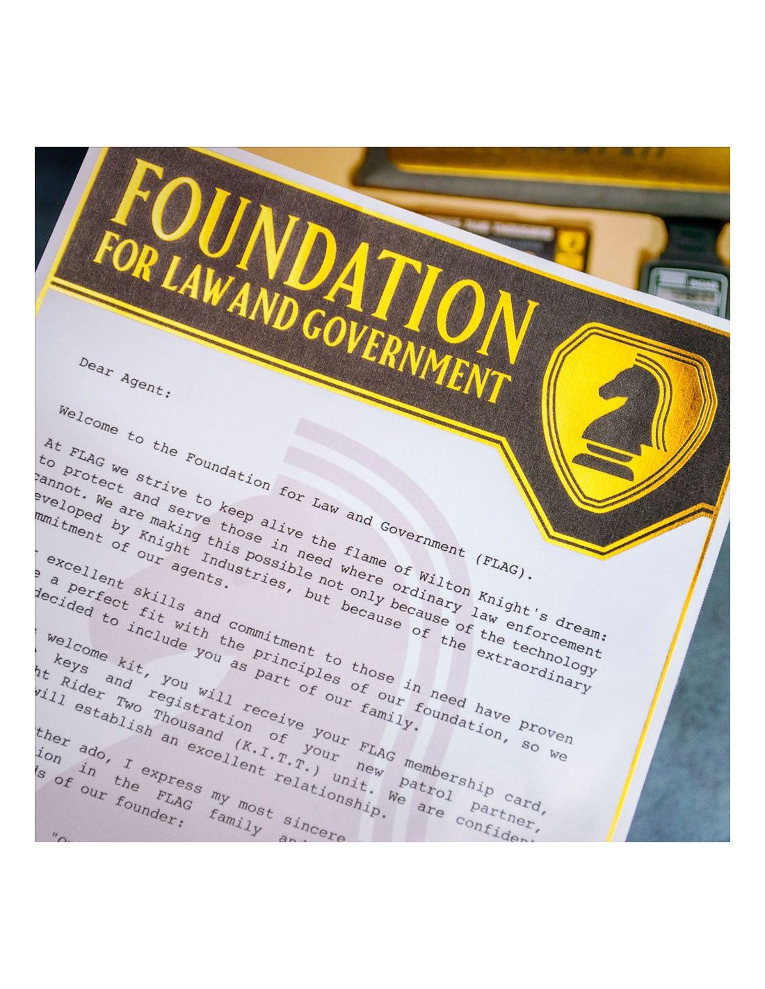 Doctor Collector presenta este kit para coleccionistas. Contenido: - Caja metálica con escáner lenticular - Réplica del reloj comunicador de Michael Knight (réplica de atrezzo con funciones básicas de reloj, no un comunicador real (no, no puedes hablar con KITT)) - Llave de encendido de KITT - Réplica de la matrícula de Knight Rider (incluye pegatinas de CA) - Cartel metálico de tinta dorada exclusivo de F.L.A.G - Licencia de operador de Michael Knight - Llavero de Knight Industries - Carta de bienvenida de F.L.A.G - Parche bordado F.L.A.G - Pin de esmalte dorado de F.L.A.G - Folleto de especificaciones generales de KITT - Etiqueta del fabricante de KITT - Tarjeta de visita de Michael Knight - Pegatina holográfica de Knight Industries - Pegatina dorada de F.L.A.G - Sobre dorado de F.L.A.G