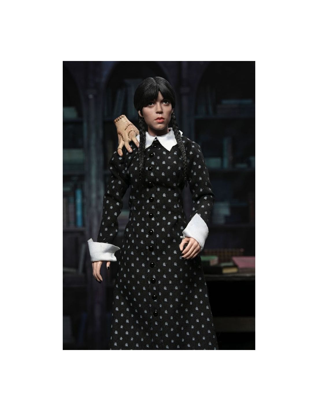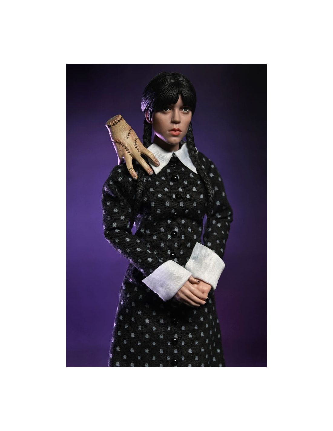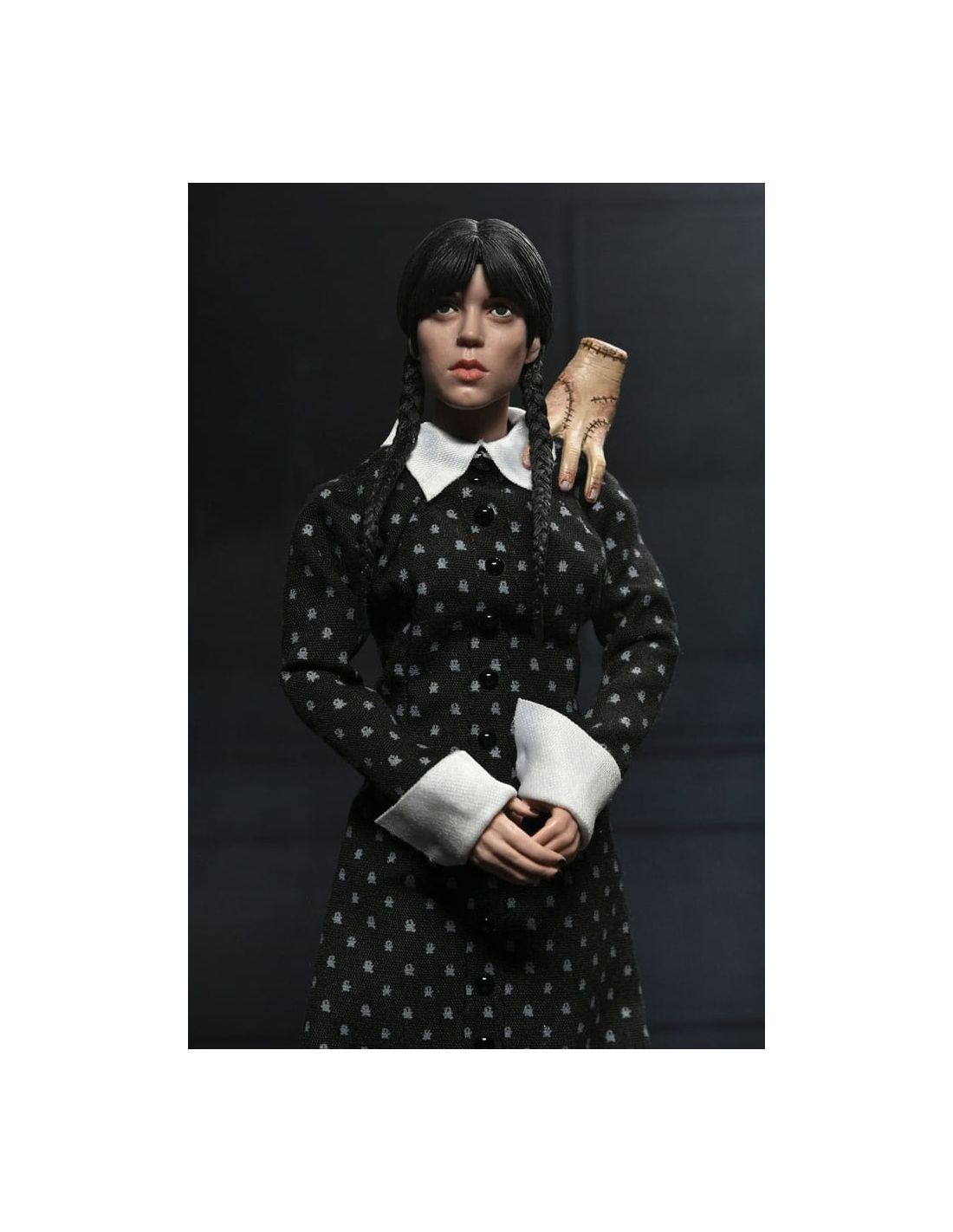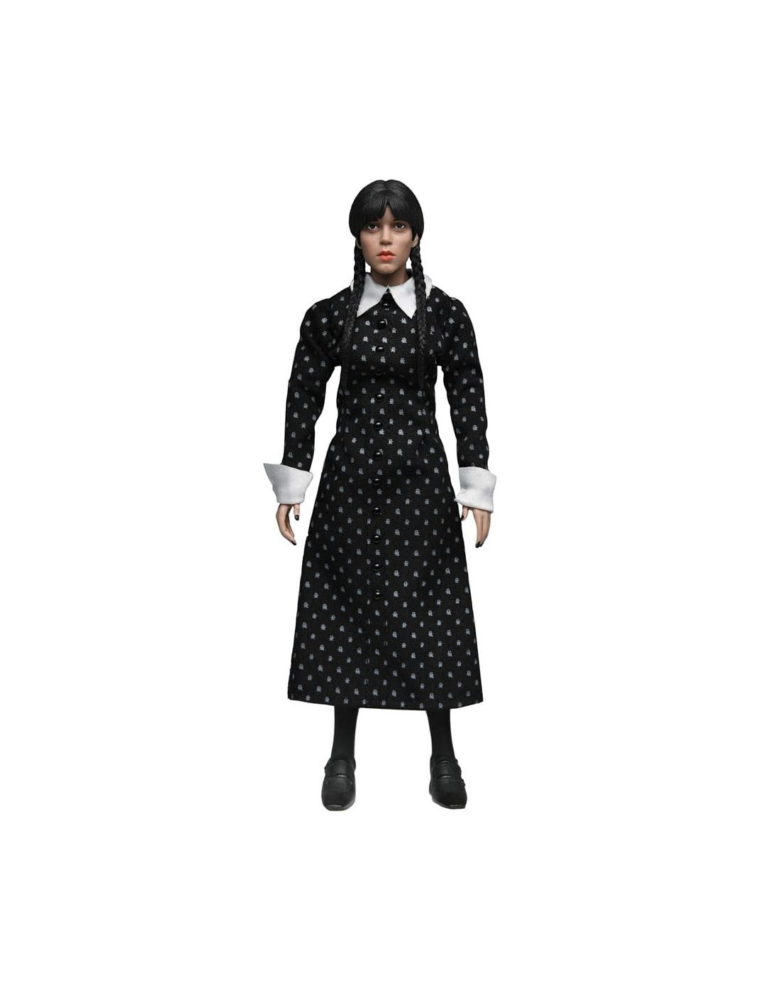 Con una altura de 20 cm, múltiples puntos de articulación y acabados detallados, es ideal tanto para exposición como para coleccionismo activo. Su diseño cuida cada aspecto del personaje: desde las trenzas hasta el patrón del vestido, reflejando fielmente la personalidad de Wednesday Addams.