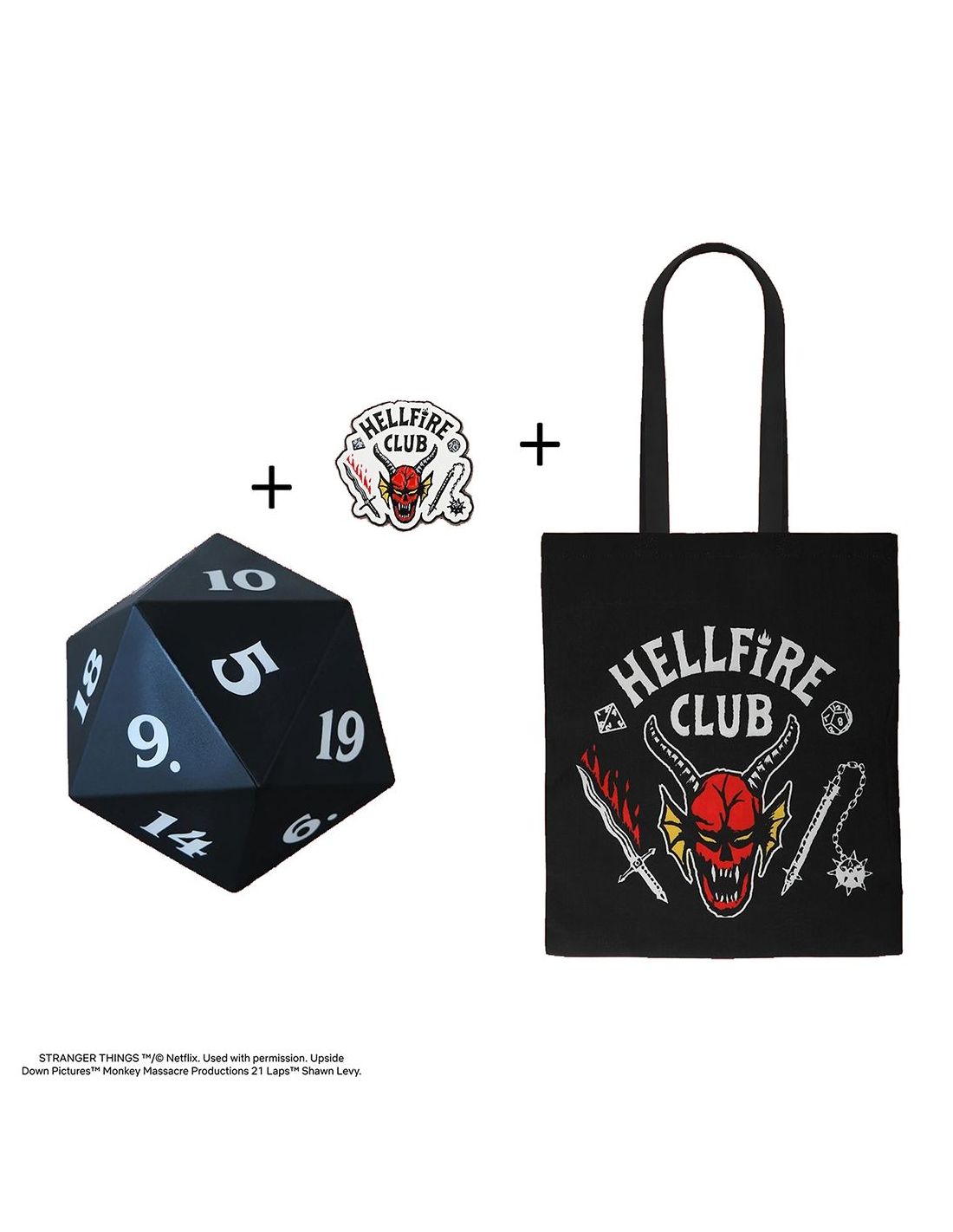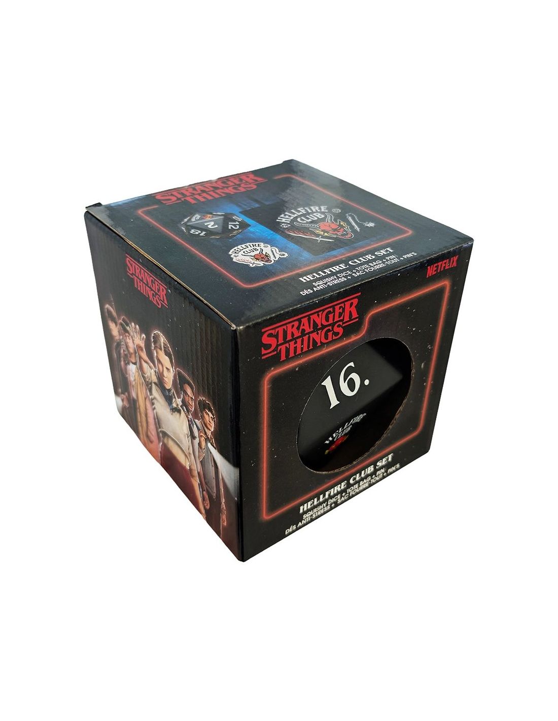 Descubre el Pack Stranger Things Hellfire Club, un set de tres artículos imprescindibles para fans: pin metálico, bolsa tote de algodón y dado squishy antiestrés. Diseño oficial inspirado en el legendario club de Dungeons & Dragons de la serie.